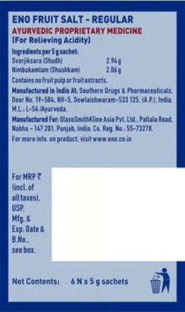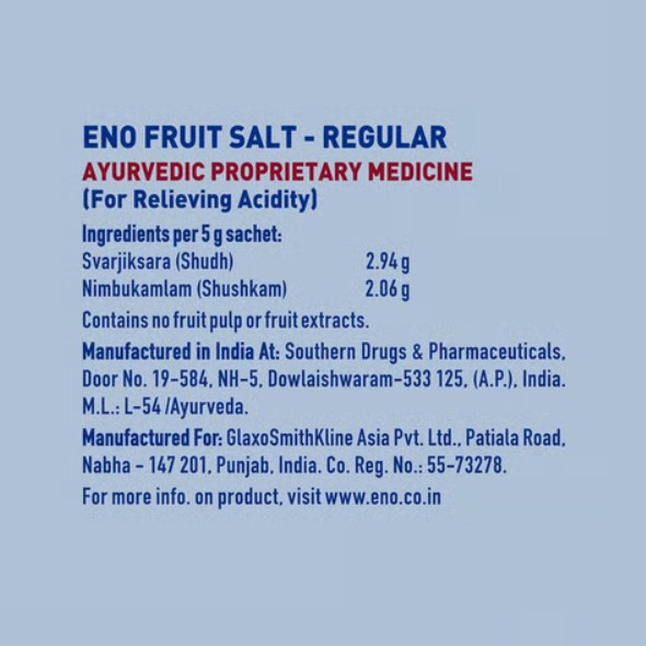 Eno Regular provides fast and effective relief from acidity, heartburn, and indigestion. Its trusted antacid formula starts working in just 6 seconds to neutralize excess stomach acid, offering quick comfort and digestive ease anytime you need it.