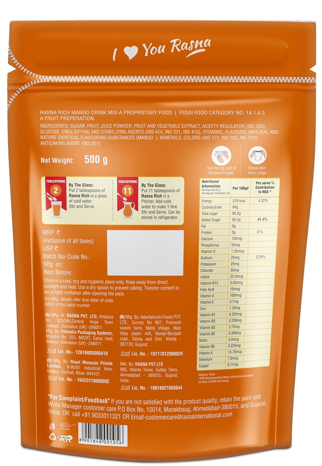 Usage:Mix the required amount of Rasna powder with cold water according to pack instructions. Stir well and serve chilled.